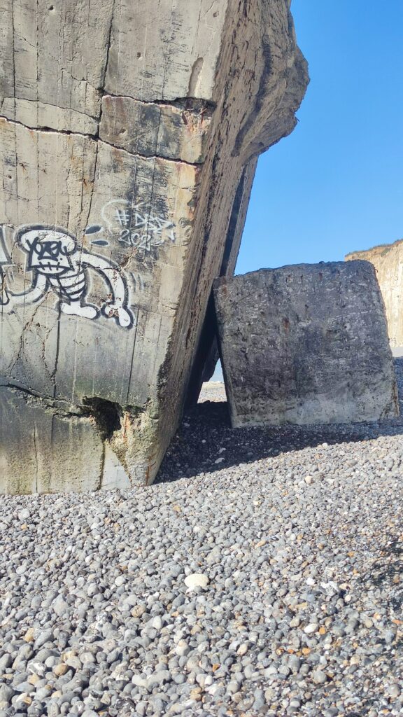 The blockhouse also provides a visual representation of coastal erosion, as although it fell at the foot of the cliff 30 years ago, it can now be found several dozen meters away from the alabaster coastline as a direct consequence of rising sea levels and global warming.