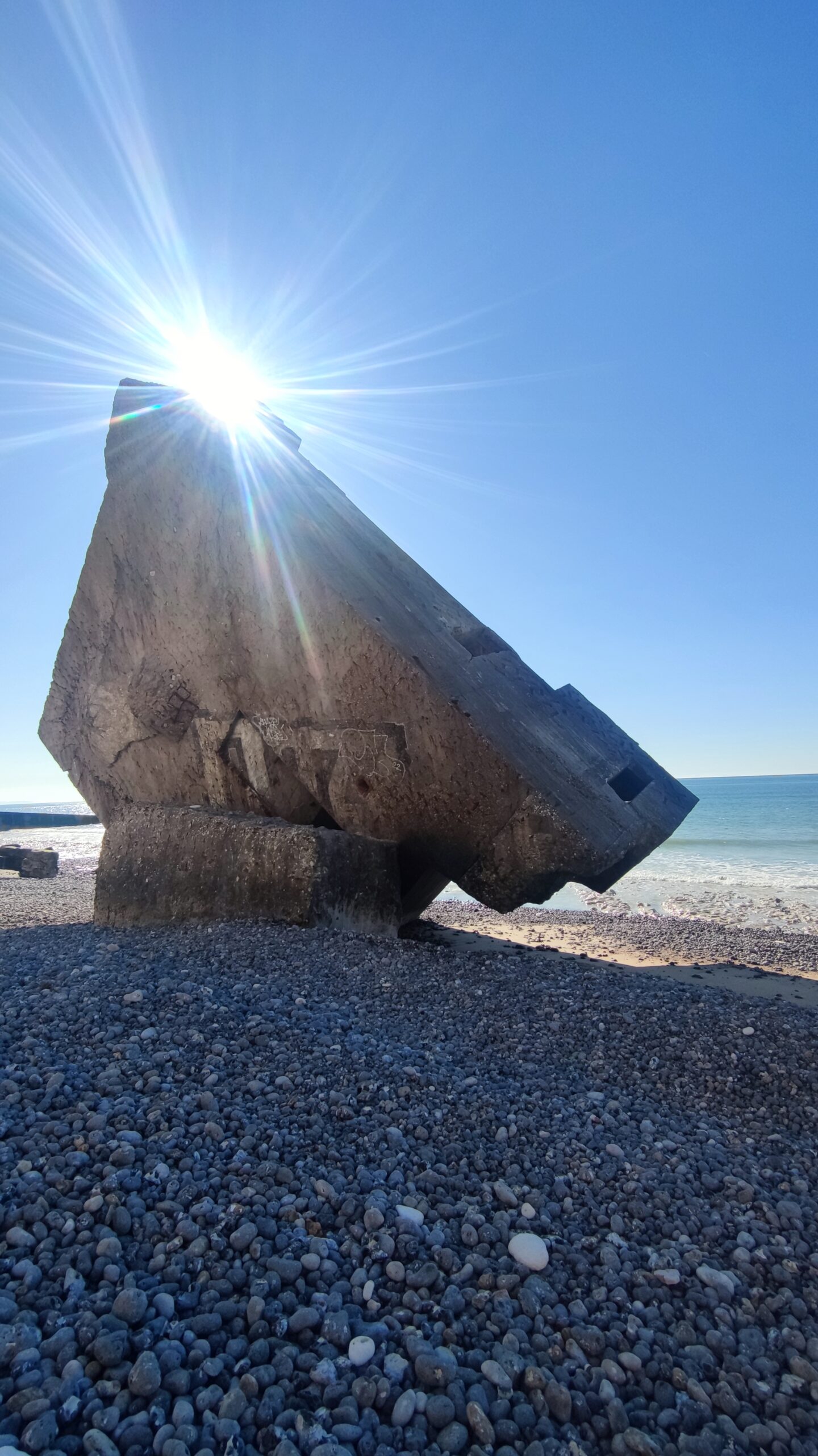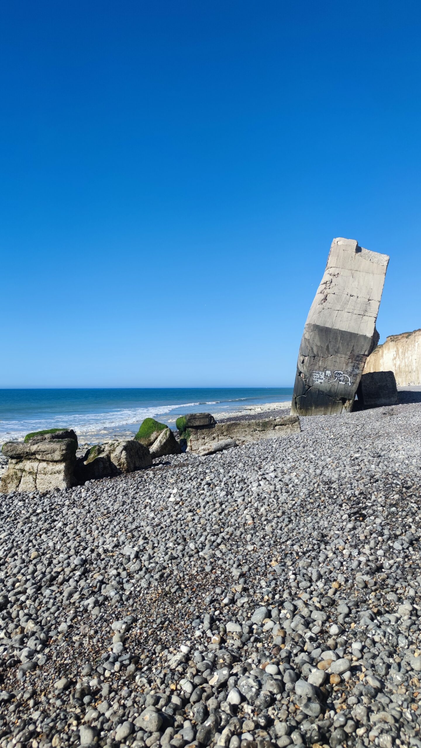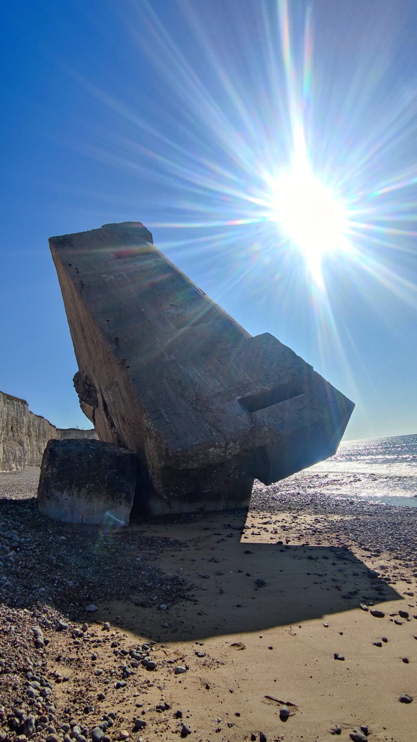 The blockhouse also provides a visual representation of coastal erosion, as although it fell at the foot of the cliff 30 years ago, it can now be found several dozen meters away from the alabaster coastline as a direct consequence of rising sea levels and global warming.