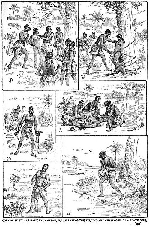 But the horror doesn’t stop at the act itself. Jameson, the “civilized” Victorian naturalist, drew six entire sketches dedicated to the slaughter and the flaying of the young slave.